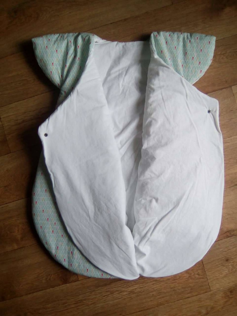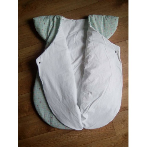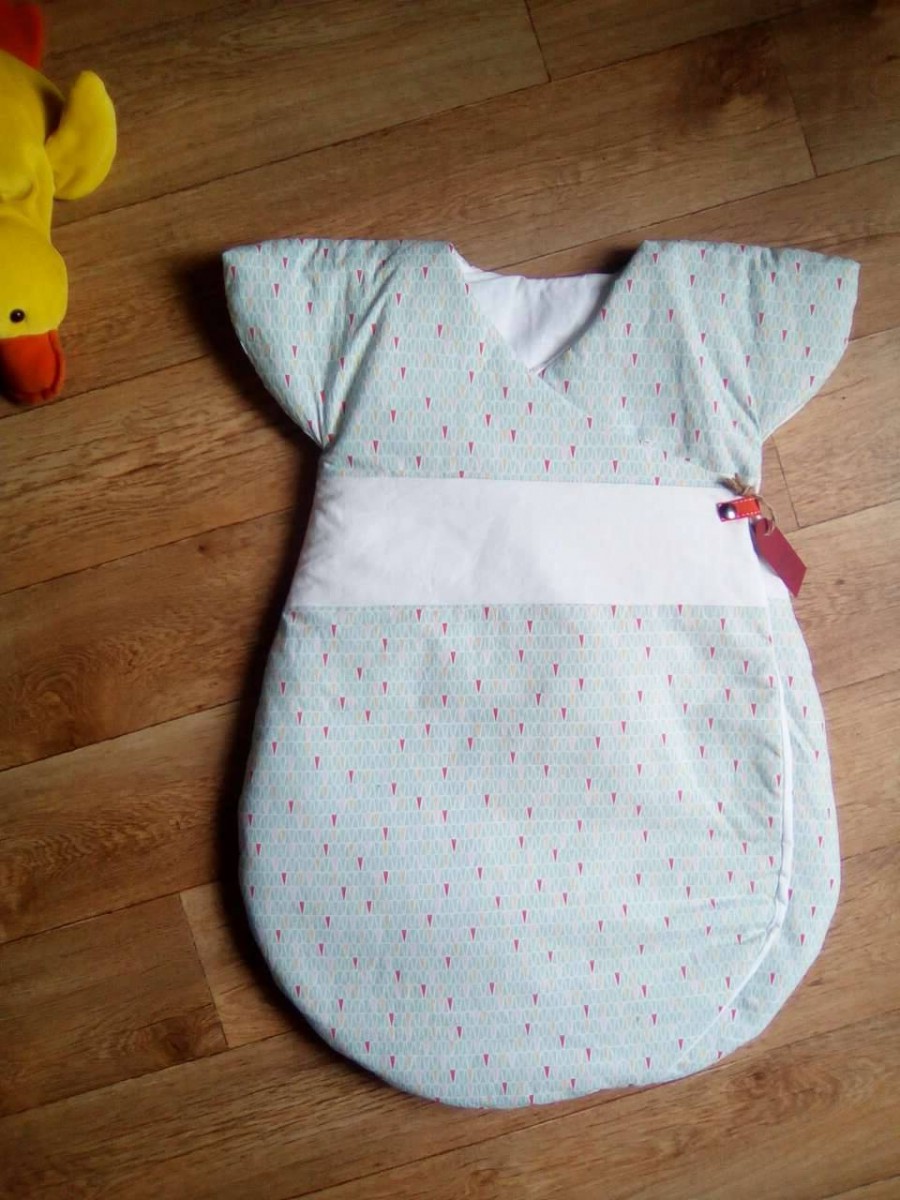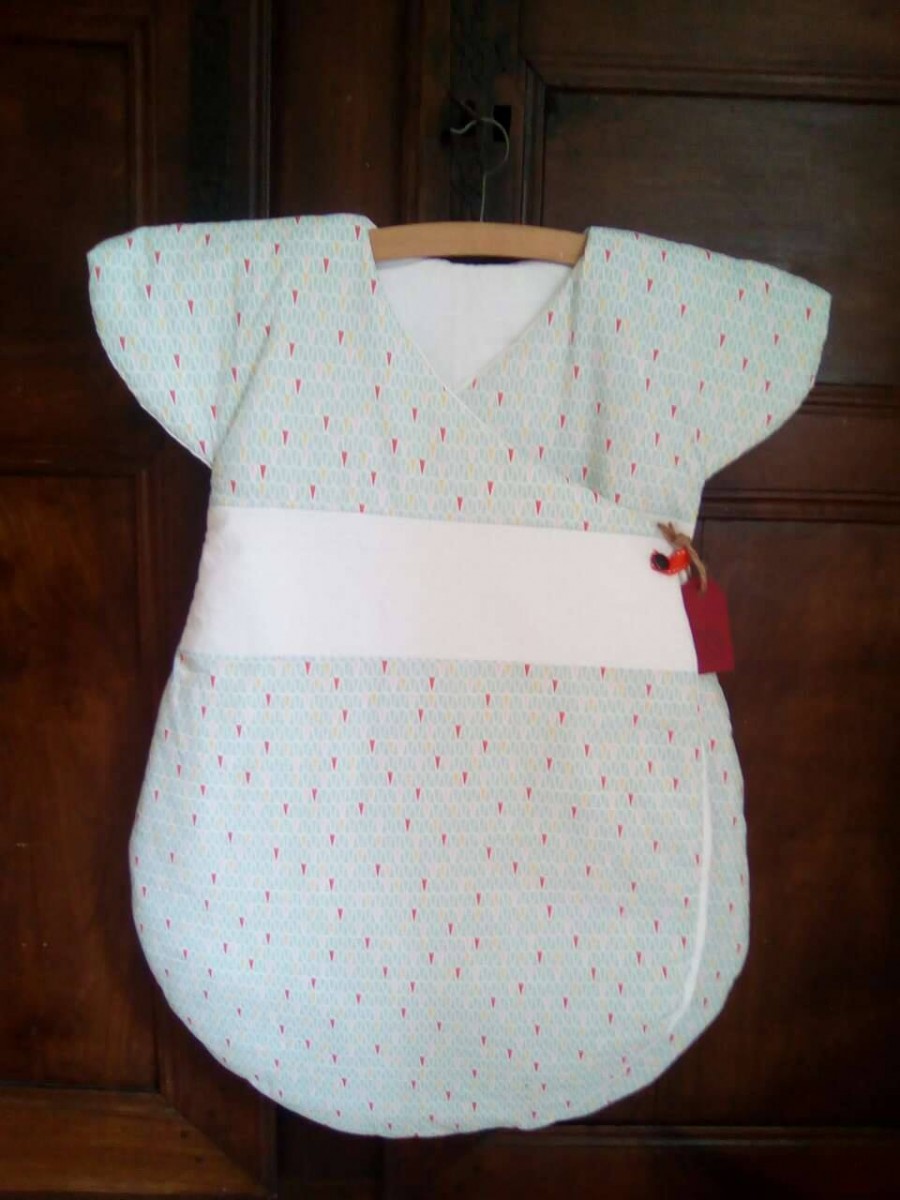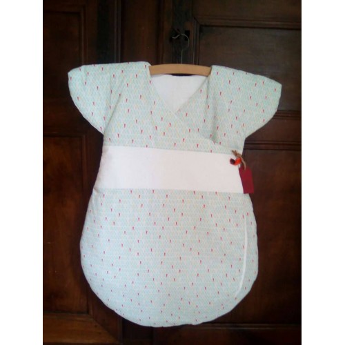 Très jolie gigoteuse d'inspiration japonaise. Maxi confort et chaude grâce à ses épaules couvertes et ses 2 pans supperposés sur le devant.