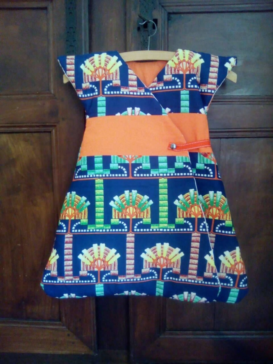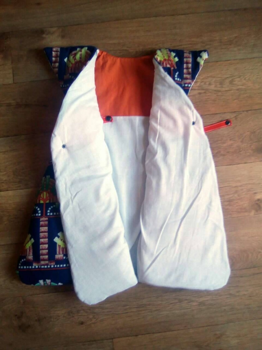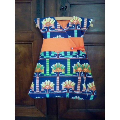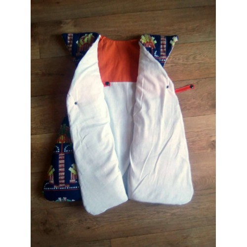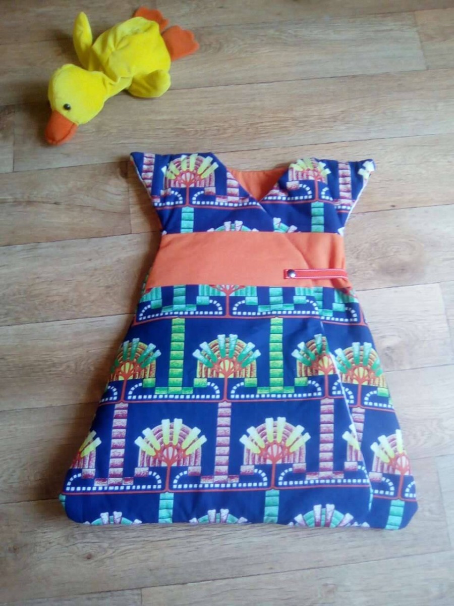 Très jolie gigoteuse en wax du Cameroun. Maxi confort et chaude grâce à ses épaules couvertes et ses 2 pans supperposés sur le devant.